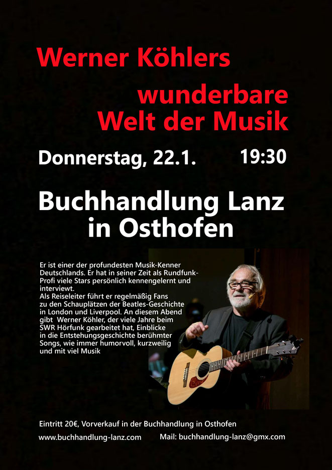 Sie können per Mail an buchhandlung-lanz@gmx.com Ihre Karten vorab bestellen oder zum Vorverkauf in die Buchhandlung kommen
